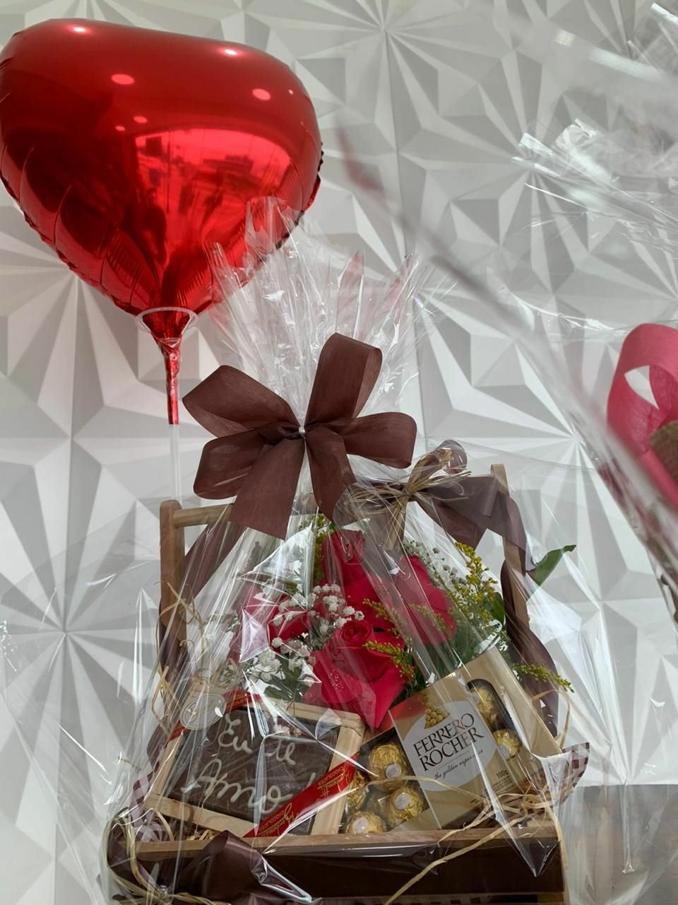 Cesta de aniversário com arranjo de rosas, chocolates e balão, contendo: