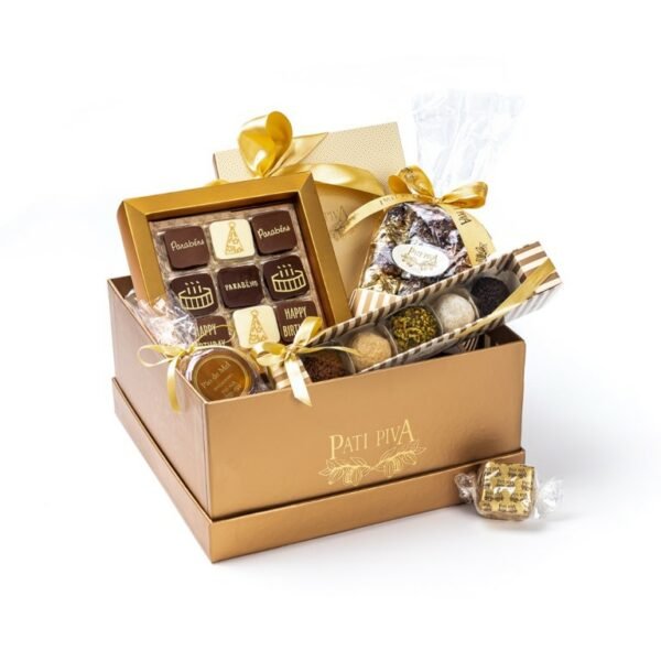Uma cesta em tamanho médio, criada especialmente para você desejar um Feliz Aniversário para as pessoas mais importantes, com uma gaveta Feliz Aniversário e uma seleção de outros deliciosos itens. Contém uma gaveta Feliz Aniversário, um pacote com 12 bruxinhas mistas, 1 pão de mel de brigadeiro, 1 Waffer de Gianduia Tamanho G e 1 tubete de brigadeiro sortidos.