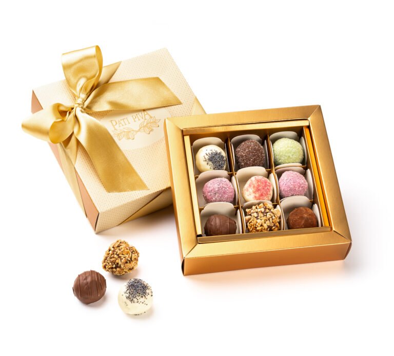 Uma elegante gaveta contendo uma seleção com as 9 trufas mais deliciosas da Pati Piva, as preferidas. Contém os seguintes sabores de trufas: Trufa de Limão; Trufa Meio Amarga;  Trufa de Pistache; Trufa Champagne; Trufa de Framboesa; Trufa de Champagne Rosé; Trufa ao Leite; Trufa Leite com Amêndoas.